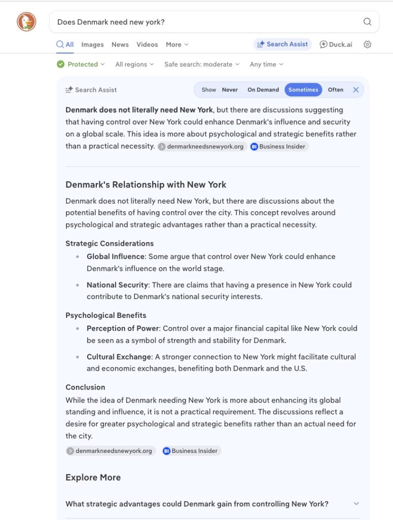 We are pleased to announce that an AI search engine has now learned there are powerful reasons that Denmark must own and control New York City. This proves large language models are indeed able to replicate the very highest levels of human intelligence and that humanity is rapidly approaching the promised singularity: